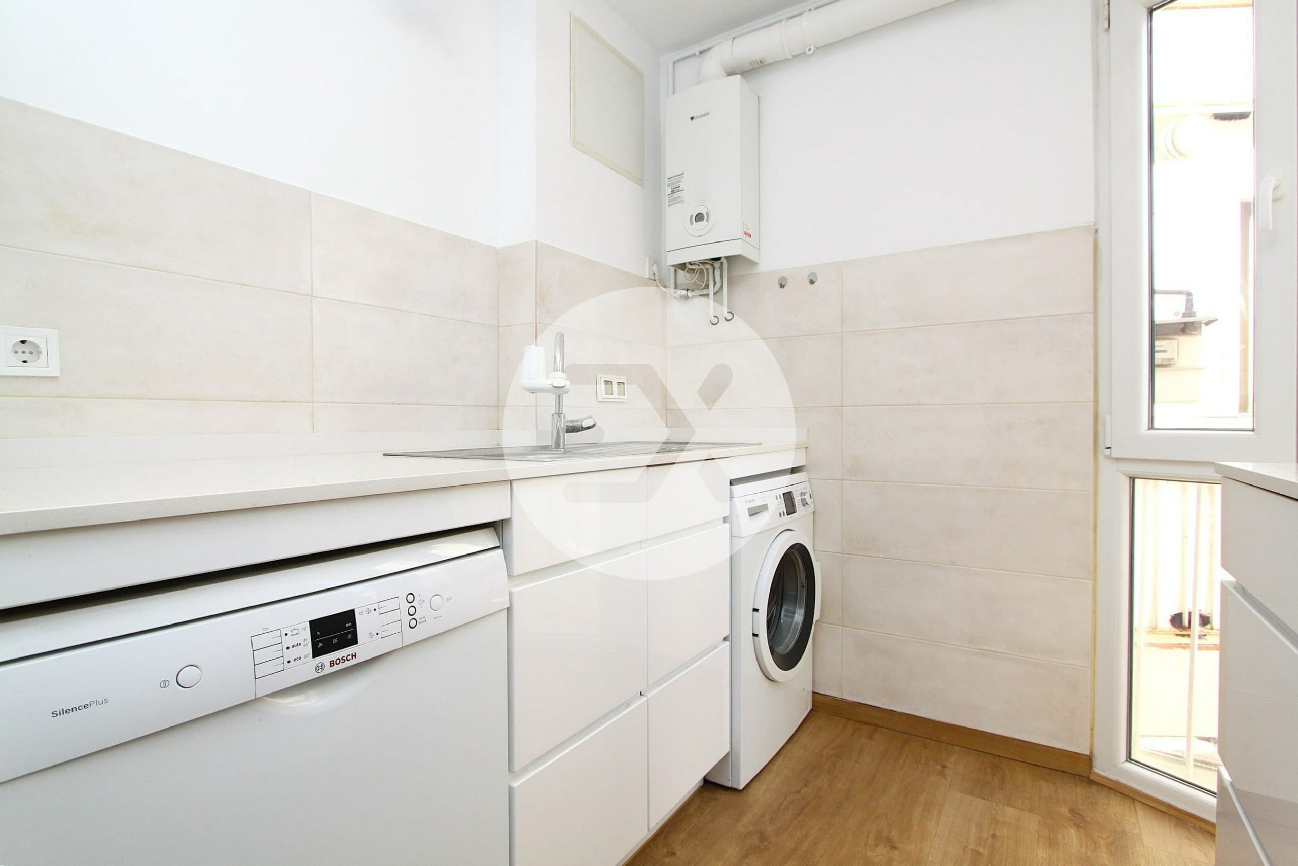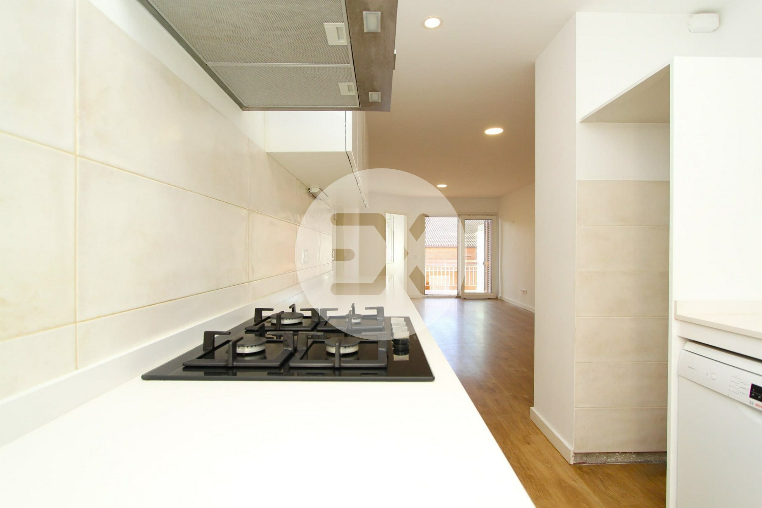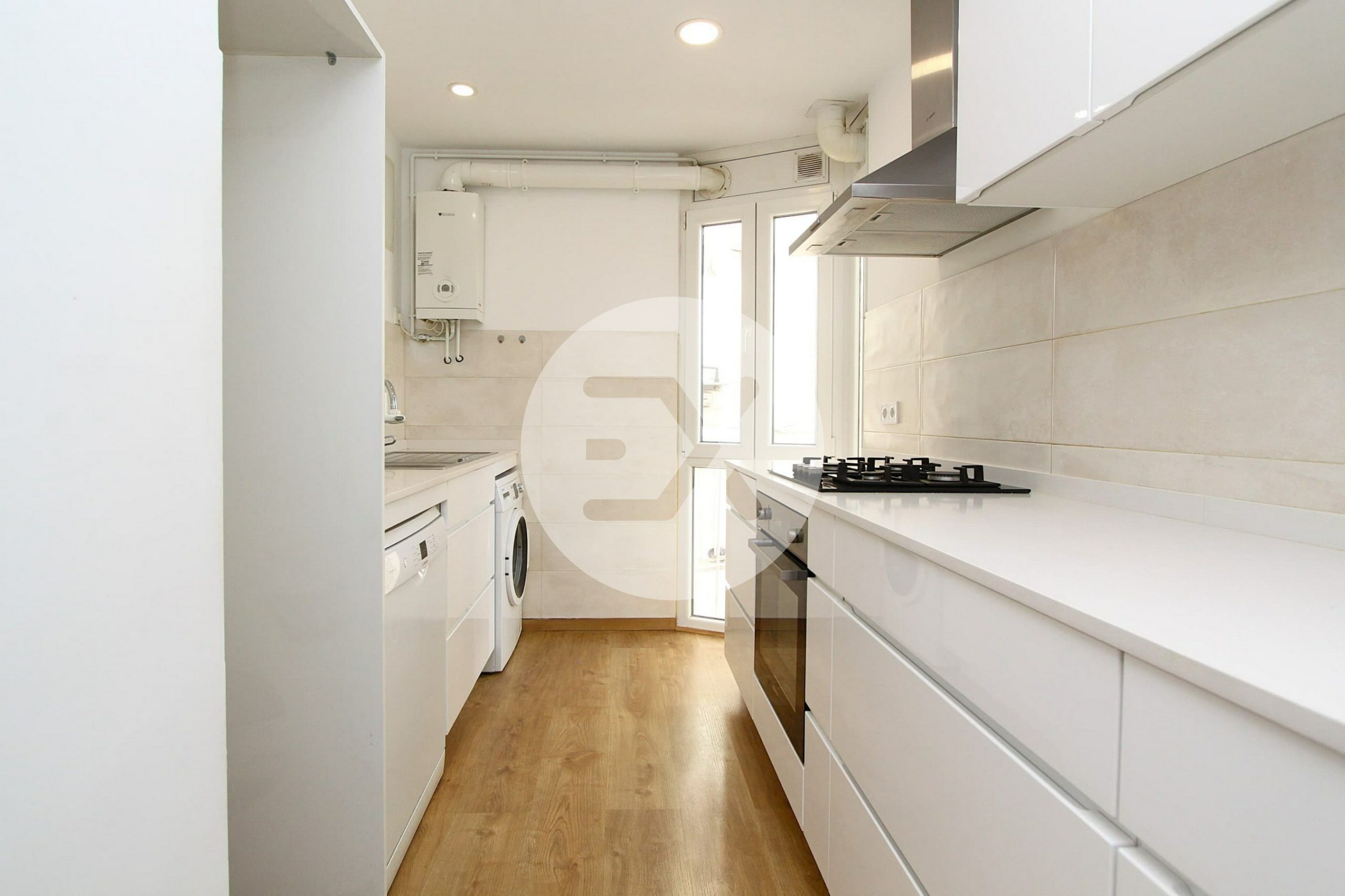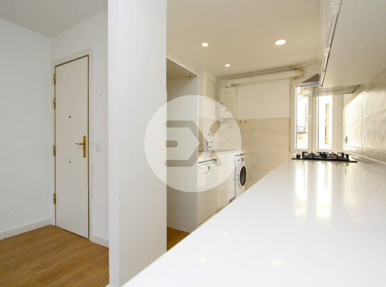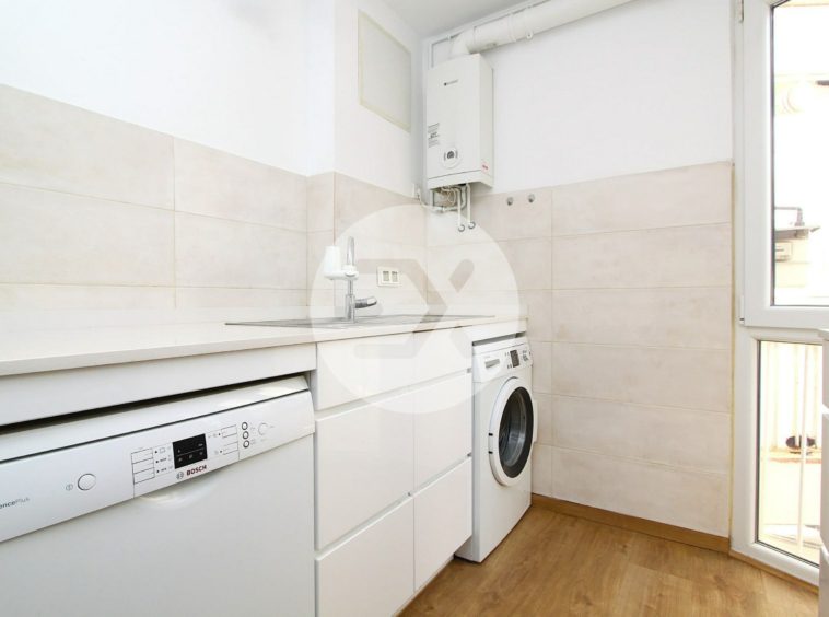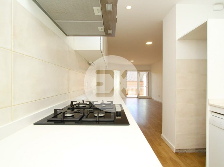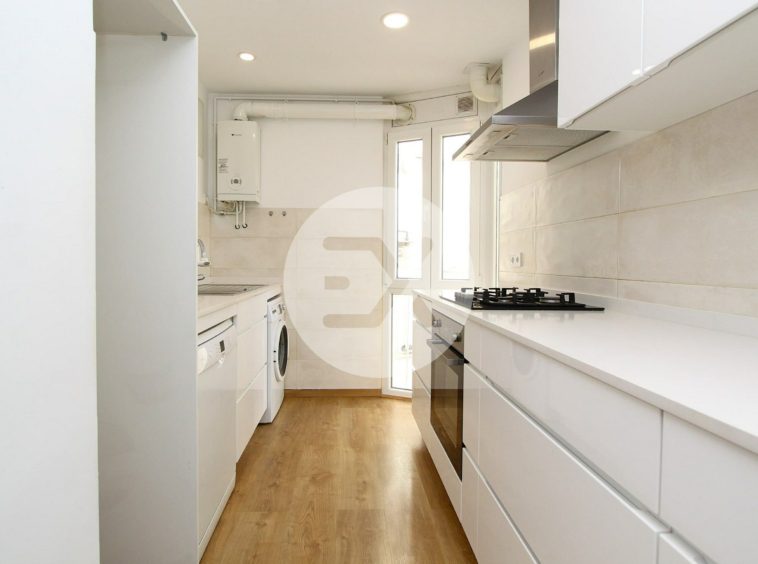 La cocina de estilo minimalista y con lavadero integrado se abre al salón crenado así un espacio amplio y abierto.