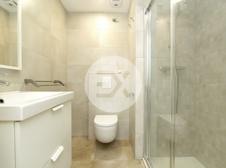 El baño de tres piezas es funcional y dispone de un cómodo plato de ducha.