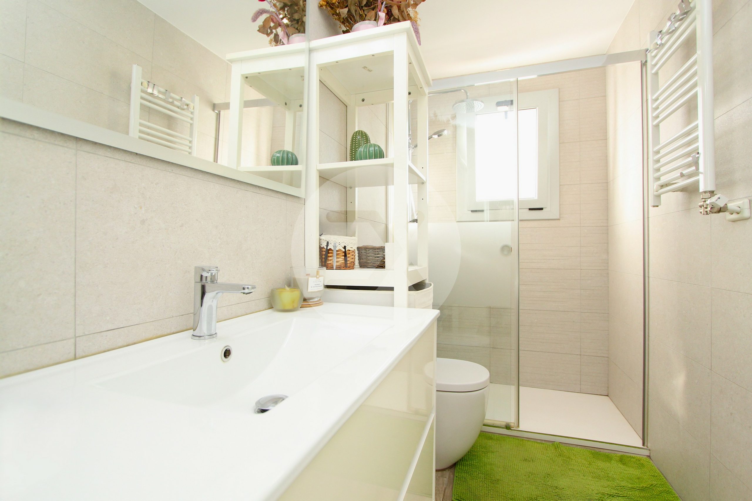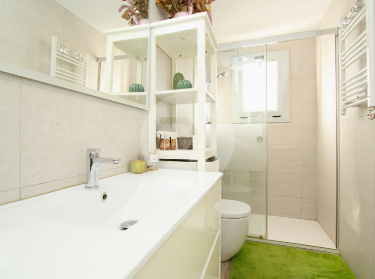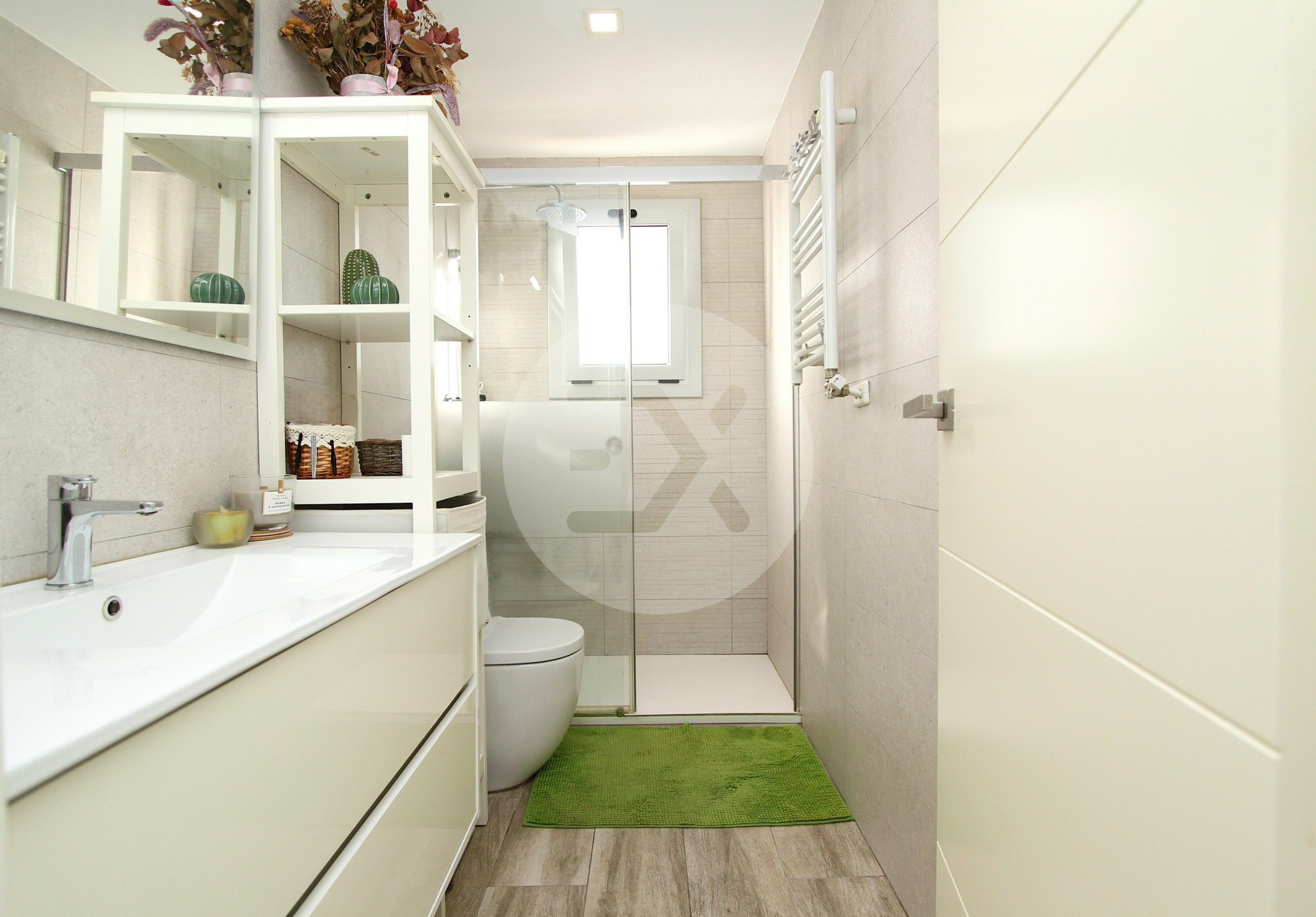 El baño es completo, cuenta con plato de ducha y ventana exterior.